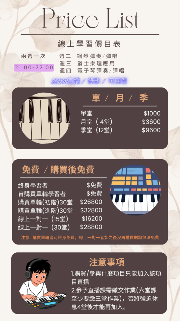 - 第01堂課 – 如何挑選節奏 (8和16beat認識) 歌曲: 小薇(黃品源) (2026/03/19)